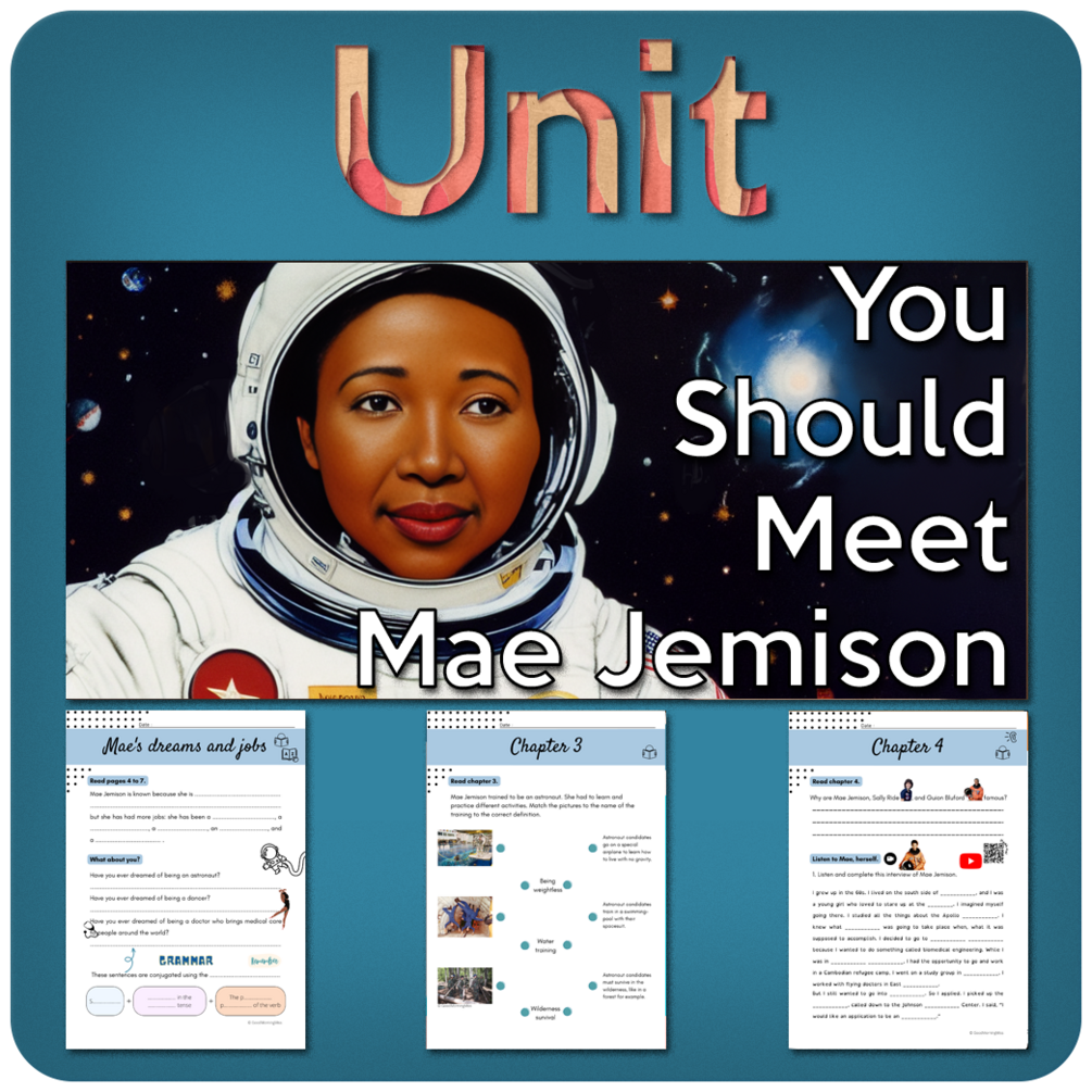 Have you ever wanted to make your students read a book but never knew how to do it? Then this unit is made for you! The worksheets to help them read and understand chapter by chapter are included, all you have to do is buy the book: “You Should Meet Mae Jemison” by Laurie Calkhoven (editions Ready To Read).